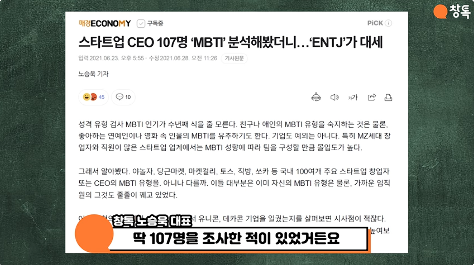 예전에 스타트업 CEO 107명의 MBTI를 조사했을 땐 ENTJ가 많았는데, 장사고수는 과연 어떻게 다를지 비교하기 위해 똑같이 107명을 조사했습니다. 그 결과를 오늘 창톡뉴스에서 전해드립니다!