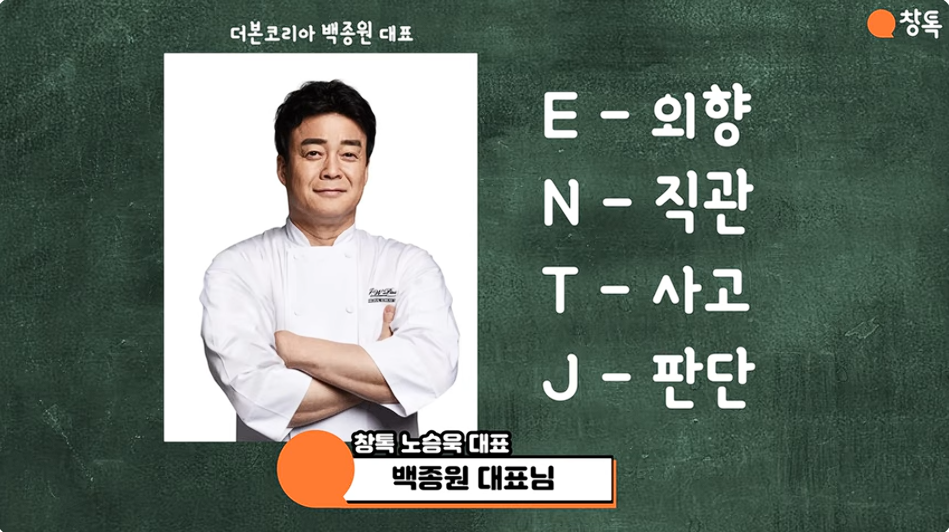 ENTJ는 흔히 ‘전략가’로 불리는데요. 대표적인 사례로는 백종원 더본코리아 대표를 비롯해, 이만재 고반식당 대표, 최승윤 백억커피/오가다 대표, 이문경 헤비스테이크 대표, 조영훈 옥된장 대표, 윤영준 스페이스콘텐츠푸드 대표 등이 있습니다.