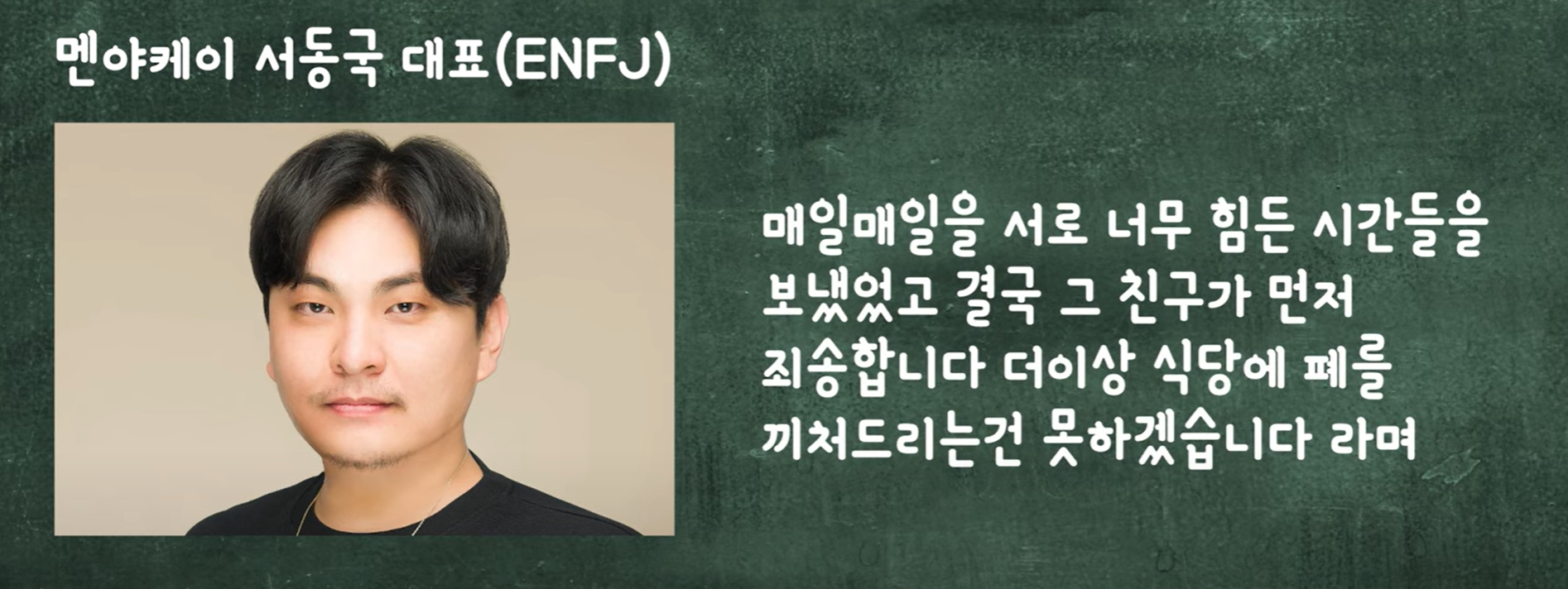 예를 들어, 멘야케이 서동국 대표는 업무 성과가 현저히 떨어져 다른 직원들과도 마찰을 빚던 직원의 해고 통보를 하지 못해서 고생한 일화를 공유했습니다. 결국 부담을 느낀 그 직원이 스스로 사표를 제출하게 됐다는데요. 그만큼 공감 능력이 뛰어나지만, 경영이라는 현실 앞에서는 T(이성적) 성향이 요구되는 때도 있습니다.