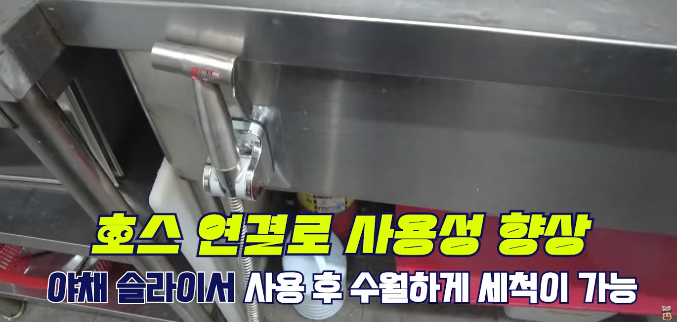 야채 절단기와 슬라이서를 앞으로 옮겨 사용 후 바로 세척할 수 있도록 호스를 연결했습니다.