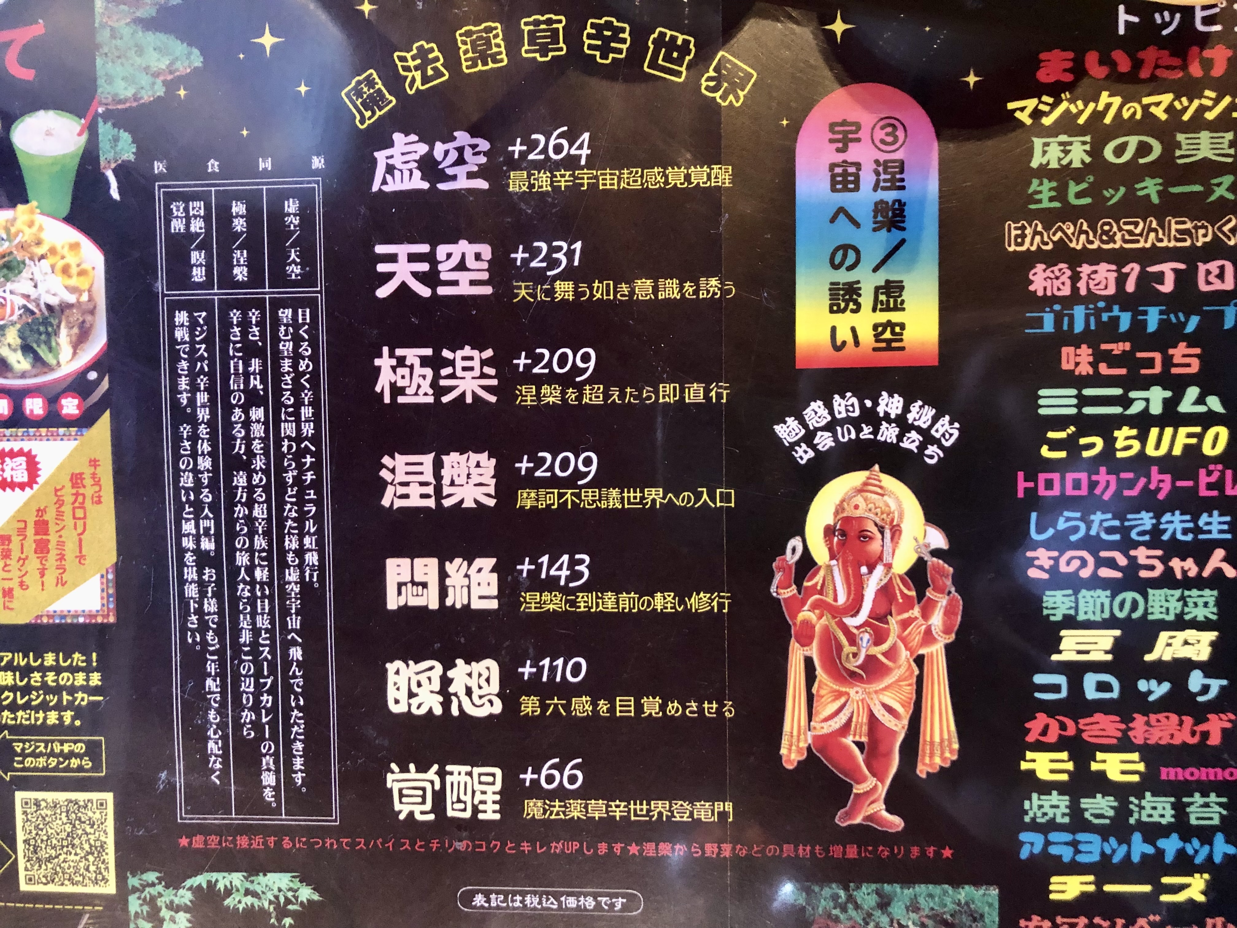 삿포로 스프카레 원조집 매직 스페이스(Magic Space)는 매운 단계를 ‘極楽(극락)’, ‘涅槃(열반)’ 등 불교 용어로 표기해, 매운 맛으로 승천하는 이미지를 소비자에게 전달합니다.