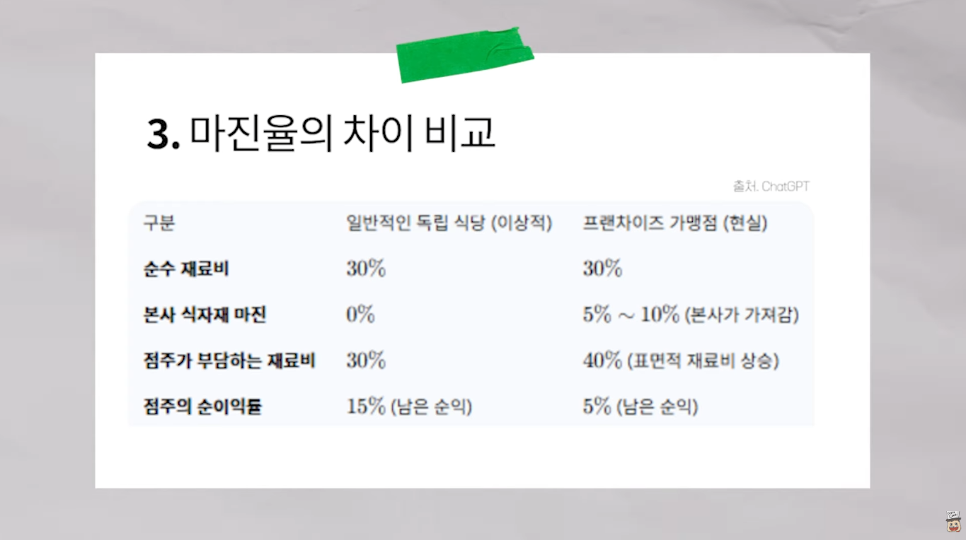 반면 본사는 로열티와 식자재 납품 마진으로 확실한 이익을 챙깁니다.